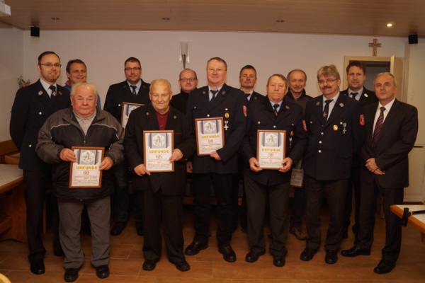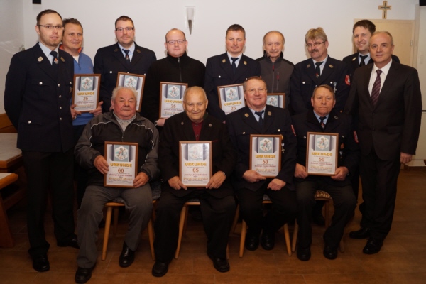 | stehend v. links: Kommandant Thomas Haas, Bernhard Eckert, Alexander Otzmann, Klaus Greller, Frank Schmid, Eduard Gmelch, 1. Vorsitzender Andreas Eckert, Kreisbrandmeister Marc Maier, 1. Bürgermeister Markus Grüner, sitzend v. links: Siegfried Dresel, Siegfried Gmelch, Bernd Schmid, Alfred Otzmann |