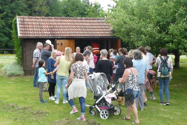 Geschwand. Die Wanderung führte den Truwia-Weg hinaus, vorbei an der Kischengemeinschaftsanlage und den Sportplätzen, weiter durchs Linden-Hölzl hinterm Friedhof vorbei durchs "Öbere Holz" zur Gartenlaube der Hölzelein. Dort durften sich die Wanderfreunde noch einmal stärken bevor sie sich auf die restlichen Meter vorbei am Wolfsloch bis hin direkt zur Grillparty der FFW Geschwand machten,