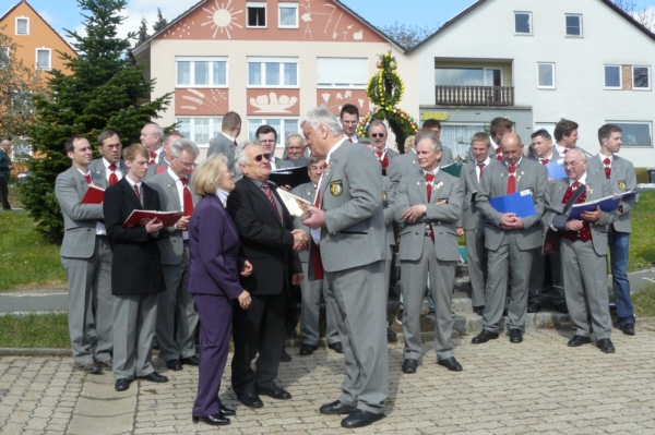 Osterkonzert am Osterbrunnen in Geschwand grautulierte der GGG dem Jubelpaar nochmals mit zwei Liedern und Bürgermeister Willi Müller im Namen der Gemeinde Obertrubach. Im Anschluss machten sich die Sänger dann noch auf nach Bieberbach um dort am Osterbrunnen bei herrlichen Wetter die vielen Besucher auf den Frühling einzustimmen. Von Franz Galster verfasste Berichte über das Singen an den Osterbrunnen sind im "Fränkischen Tag" und in den "Nordbayerischen Nachrichten" erschienen. |