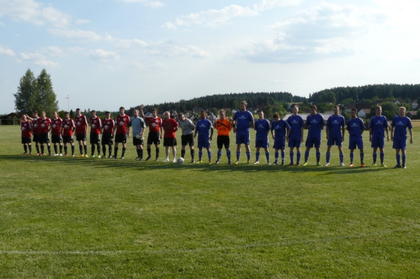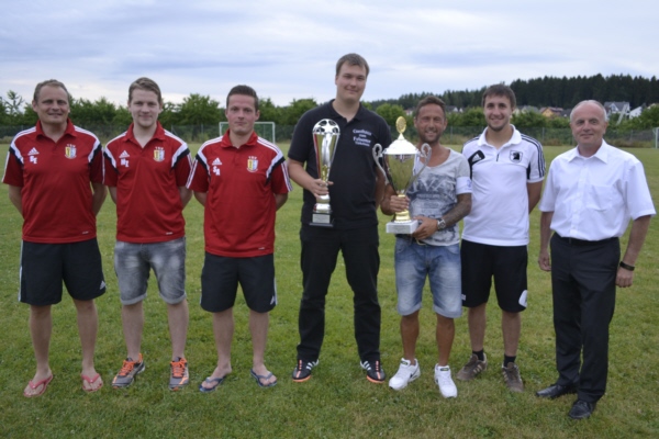 | 1. Bürgermeister Markus Grüner(rechts) überreichte den Spielführern der SG Bieberbach/Bärnfels II und der SpVgg Obertrubach den Pokal für den Sieg beim Gemeindepokaltunier 2015 in